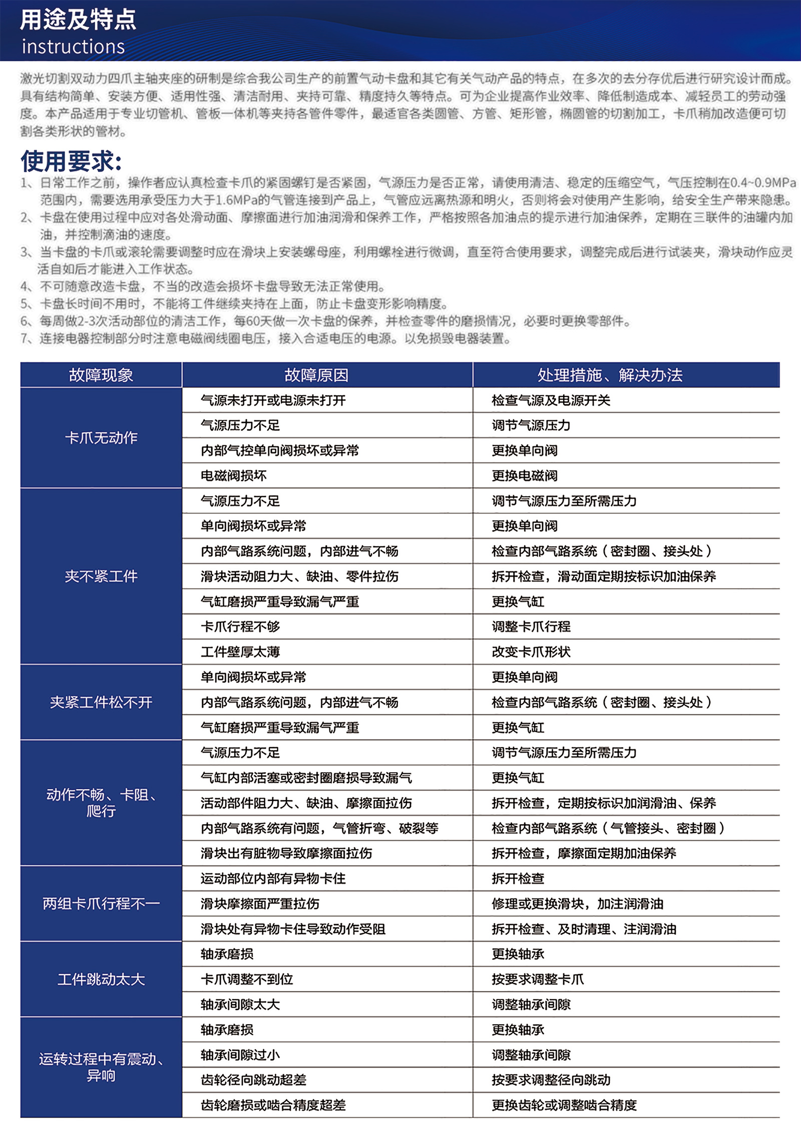 激光切割雙動(dòng)力四爪主軸夾座的研制是綜合我公司生產(chǎn)的前置氣動(dòng)卡盤和其它有關(guān)氣動(dòng)產(chǎn)品的特點(diǎn),在多次的去分存優(yōu)后進(jìn)行研究設(shè)計(jì)而成。具有結(jié)構(gòu)簡(jiǎn)單、安裝方便、適用性強(qiáng)、清潔耐用、夾持可靠、精度持久等特點(diǎn)??蔀槠髽I(yè)提高作業(yè)效率、降低制造成本、減輕員工的勞動(dòng)強(qiáng)度。本產(chǎn)品適用于專業(yè)切管機(jī)、管板一體機(jī)等夾持各管件零件,最適官各類圓管、方管、矩形管,橢圓管的切割加工,卡爪稍加改造便可切割各類形狀的管材。